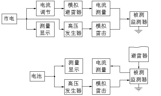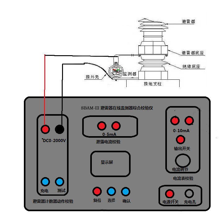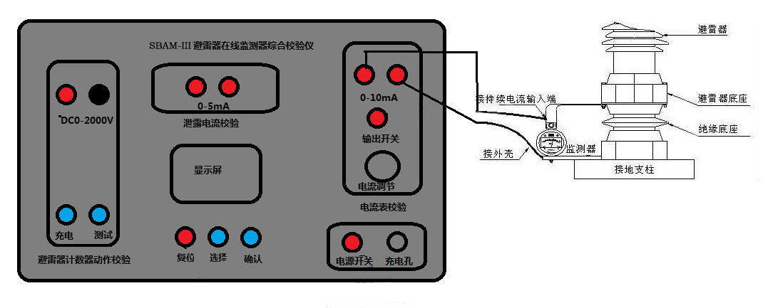 二、 測試的項(xiàng)目及方法 1、 監(jiān)測器在線狀態(tài)(即監(jiān)測器在運(yùn)行中) ①:測試監(jiān)測器電流表的準(zhǔn)確度有效值 方法:通過儀器測量的避雷器持續(xù)電流與監(jiān)測器所測量的避雷器持續(xù)電流值進(jìn)行比較。 ②:測試監(jiān)測器污穢表的準(zhǔn)確度 方法:通過測量污層電流值然后換算成相應(yīng)的電導(dǎo)率μS值然后與監(jiān)測器所測量的μS值進(jìn)行比較。 ③:測試監(jiān)測器動作計(jì)數(shù)器動作電壓 方法:通過模擬雷擊使監(jiān)測器計(jì)數(shù)器動作。 2、監(jiān)測器停電狀態(tài)(即監(jiān)測器不帶電的狀態(tài)下) ①:測試監(jiān)測器電流表的準(zhǔn)確度有效值 方法:將儀器模擬的避雷器持續(xù)電流通過監(jiān)測器并比較儀器測量值與監(jiān)測器測量值。 ②:測試監(jiān)測器污穢表的準(zhǔn)確度 ③:測試監(jiān)測器動作計(jì)數(shù)器動作電壓值 三、 工作原理