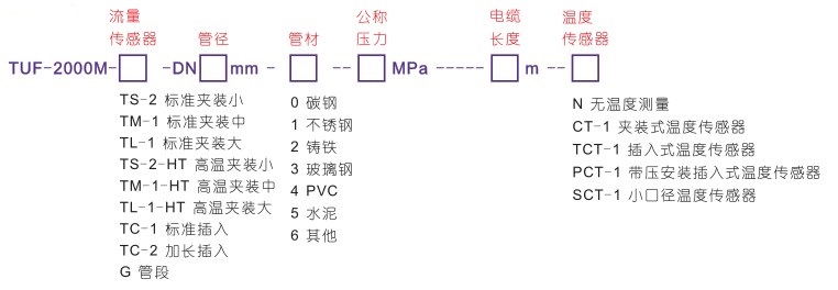 舉例說明:TUF-2000M-TM-1-DN300-0-1.6MPa-10m-PCT-1 說明:超聲波熱量流量模塊,中型夾裝式傳感器,管徑DN300,碳鋼材質(zhì)、公稱壓力1.6MPa,主機與傳感器之間電纜長度是10m,具有熱量測量功能,配接帶安裝插入式溫度傳感器。 可選配的流量傳感器 根據(jù)不同的流體、管道條件及安裝方式,可以選擇不同的傳感器。(不同傳感器的安裝方式及特點參看測量組成圖)