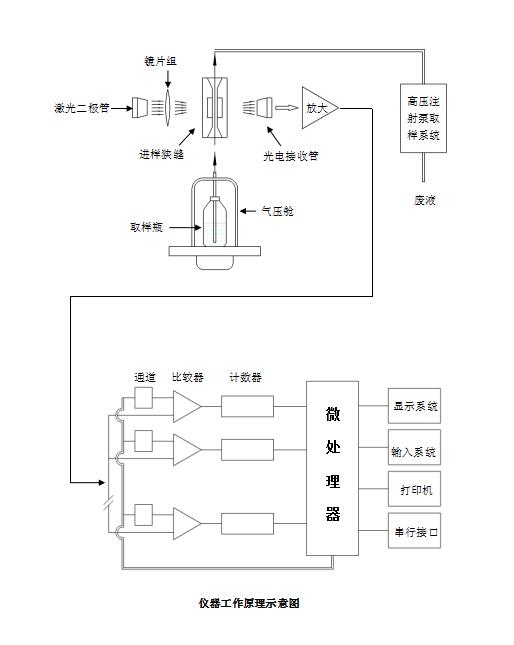 ■ 檢測(cè)通道:8通道任意設(shè)定粒徑尺寸(傳感器測(cè)試范圍內(nèi)) ■ 分辨率:優(yōu)于10%(GBT18854-2002) ■ 重復(fù)性:RSD<2% ■ 介質(zhì):液壓油、燃料油、透明液體 ■ 粘度范圍:350cSt ■ 取樣體積:0.2~1000.0ml ■ 取樣精度:優(yōu)于±1% ■ 取樣速度:5mL/min ~80mL/min ■ 氣壓艙真空:0.08MPa ■ 氣壓艙壓力:0.8MPa ■ 極限重合誤差:10000粒/mL ■ 數(shù)據(jù)輸出方式:儀器測(cè)試顯示、內(nèi)置打印機(jī)打印輸出、RS232標(biāo)準(zhǔn)串口輸出 ■ 數(shù)據(jù)存儲(chǔ):100組 ■ 電源:220V、50Hz ■ 標(biāo)準(zhǔn):內(nèi)置GJB420B、ISO4406、NAS1638、ГOCT17216-71和用戶自定義的各種標(biāo)準(zhǔn) 儀器工作原理 ![]() |