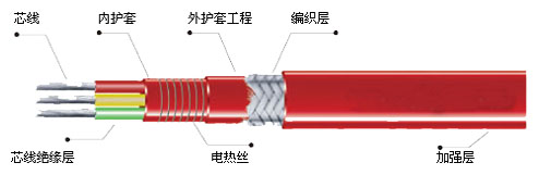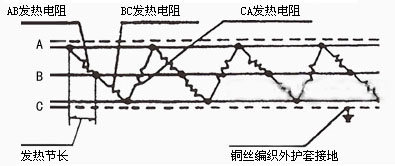 三根平行絕緣銅絞線為電源母線,在內(nèi)護套絕緣層上纏繞電熱絲,并將電熱絲每隔一定距離(即“發(fā)熱切長”)分別依次與電源母線AB—BC—CA—AB……反復循環(huán)連接,在每二相間形成連續(xù)并聯(lián)電阻。當母線通以三相電后,各并聯(lián)電阻同時發(fā)熱,因而形成一條連續(xù)三相供電的加熱帶。