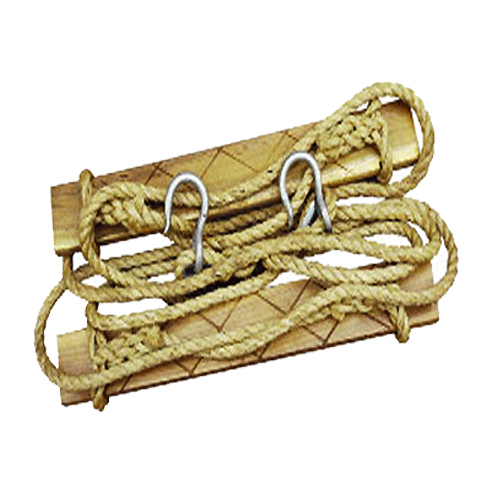 結(jié)構(gòu)特征是木踏板在兩側(cè)相應(yīng)位置切去與固定板相同厚度一塊,用固定板將繩索卡住并用木螺釘緊固在木踏板兩端的兩側(cè)面。徹底解決了繩索與木踏板上滑動(dòng)、滑脫的問題,具有結(jié)構(gòu)簡單,實(shí)用可靠的特點(diǎn)。