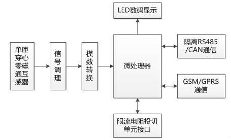 變壓器鐵芯接地電流通過穿心式電流互感器隔離變換為小信號(hào),經(jīng)信號(hào)轉(zhuǎn)換、濾波與放大等調(diào)理電路,由模數(shù)轉(zhuǎn)換器變換為數(shù)字信號(hào),微處理器經(jīng)過數(shù)字濾波與運(yùn)算獲得鐵芯接地電流;本地顯示接口可顯示實(shí)時(shí)接地電流,當(dāng)超過報(bào)警限值時(shí)具有LED指示;裝置可通過隔離RS485/CAN/GSM/GPRS通信接口(訂貨時(shí)選擇)與狀態(tài)監(jiān)測(cè)系統(tǒng)等后臺(tái)實(shí)時(shí)通信。
