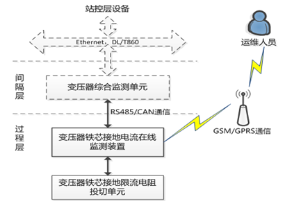 變壓器鐵芯接地電流在線監(jiān)測(cè)裝置可適應(yīng)各種環(huán)境條件下對(duì)變壓器進(jìn)行監(jiān)測(cè),根據(jù)不同的應(yīng)用需求,裝置可配置為接入變電設(shè)備綜合狀態(tài)監(jiān)測(cè)系統(tǒng)、獨(dú)立GSM短信實(shí)現(xiàn)監(jiān)測(cè)、或兩者結(jié)合應(yīng)用。應(yīng)用示意如下圖: